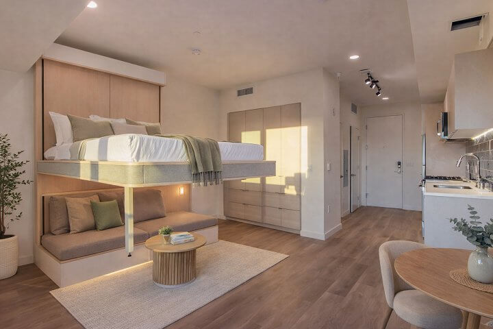 These have the bed that raises to ceiling from an app, to create more room. They are studios but feel like one bedrooms when bed moves up.